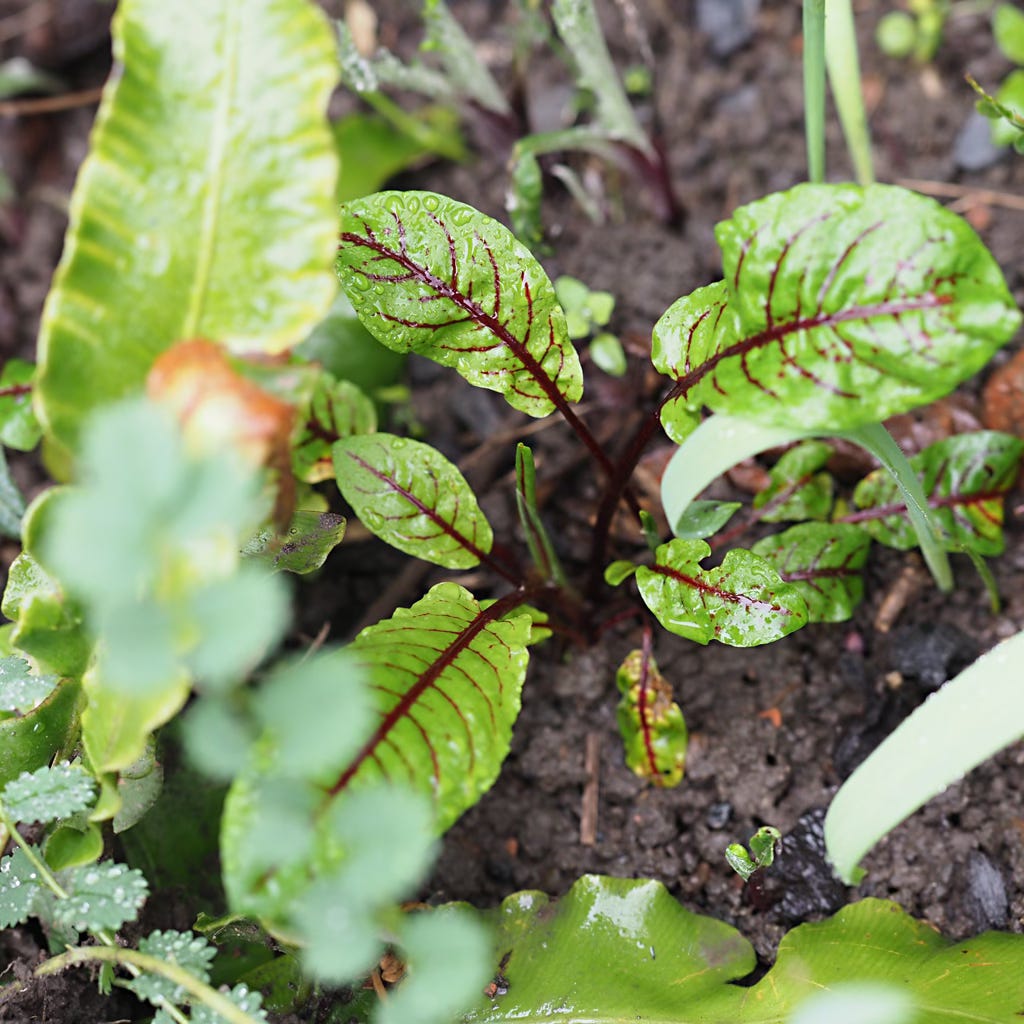 This particular sorrel falls firmly in the category of an edible that’s just as nice to look at as to eat (and yes, I’m avoiding the ghastly portmanteau term which, for some reason, makes me momentarily livid whenever I encounter it). Bright green, spoony to spear-shaped leaves1 with, as you might imagine from the name, beetroot-red veins and stems. It’s a low growing wonder, a cut-and-come-again delight that knits together beautifully in a nommable ground cover tapestry – for the potager, kitchen garden, or anywhere you would care to employ such carpeting – with alpine strawberries and salad burnet, and while perennial, here it’s also behaving in a reliably evergreen fashion. Leave it to mature and it will grow to about 60cm in height, the leaves toughening and becoming increasingly bitter as it nears flowering, but even then, it’s still a beauty.
